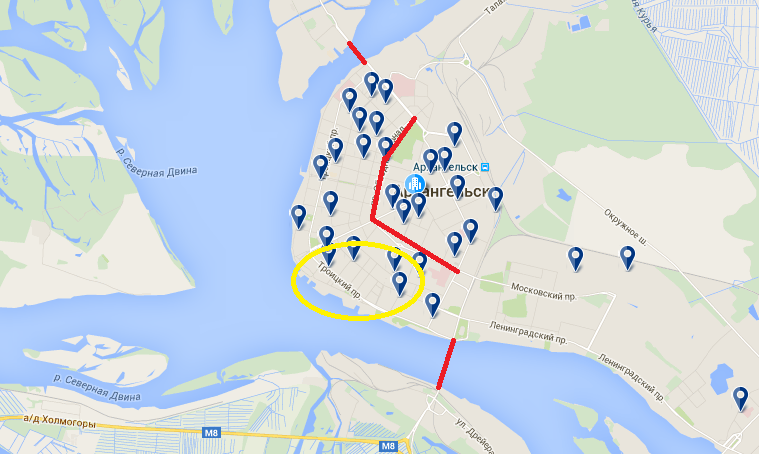 Как уже упоминалось выше, город очень растянут вдоль реки. В отдалении от центра на побережье разместились многочисленные лесоперерабатывающие предприятия. В настоящий момент предприятия закрыты, жители стараются переехать поближе к центру. В темное время суток (не забывайте, что летом оно светлое) туристам не следует посещать Факторию, Маймаксу, Исакогорку или Сульфат (не пересекайте красную линию).