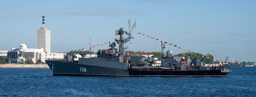 На рейде Северной Двины выстраиваются военные корабли и подводные лодки, в небе показывает фигуры высшего пилотажа военная авиация, проводится показательная высадка морского десанта на городской пляж.