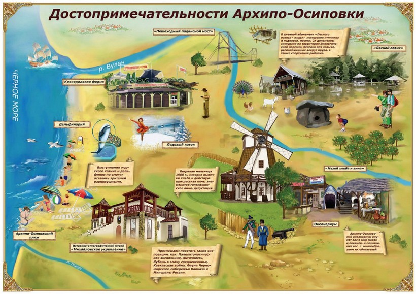 В Архипо-Осиповке, помимо развлечений в самом селе, можно приобрести экскурсионные туры в ближайший город Геленджик, Горячий Ключ, на дегустации вин в Абрау-Дюрсо, в Абхазию. Цены начинаются от 600 RUB со взрослого. В самой Архипо-Осиповке тоже есть несколько музеев и развлекательных мест. О них я расскажу ниже.