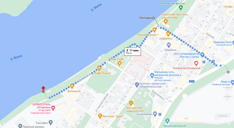 Чтобы сесть на пригородный теплоход, от кремлевской стены по ул. Пугачева нужно выйти на Петровскую набережную и дойти до причала «Отель "Азимут"». Путь около 950 м займет 11 мин.