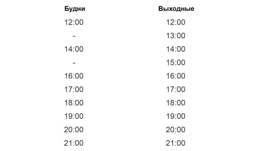 Речной трамвайчик выполняет рейсы ежедневно без выходных в период с 12:00 до 21:00. В будние дни интервал между рейсами составляет 2 часа, а после 16 часов и в выходные — 1 час. Владельцы речного трамвайчика могут отменить рейс при неблагоприятных погодных условиях.