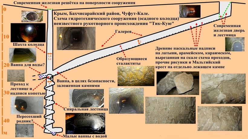Осадные колодцы есть во всех пещерных городах Крыма. Они служили укрытием для жителей города во время его осад и являлись источником воды на случай перекрытия доступа к источникам. С тюркского языка название переводится как вертикальный колодец. Грандиозные вертикальные и горизонтальные шахты, сакральные надписи, стертые ступени темных подземелий. Всякому будет любопытно. Вход в колодец платный, он не включен в стоимость билета на посещение города, на момент моего его посещения полный билет стоил 300 рублей, льготный — 150.