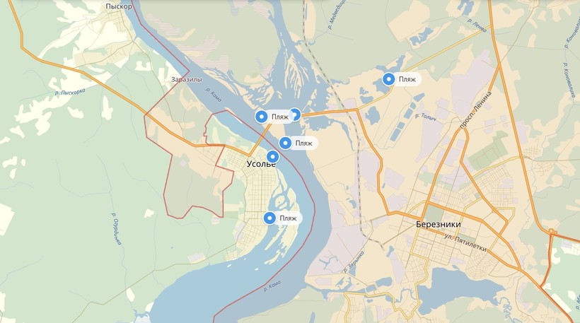 В основном, купаются на Камских заливах (пляжи показаны на карте)— это водоемы, разделенные дамбой автодороги Березники — Усолье.