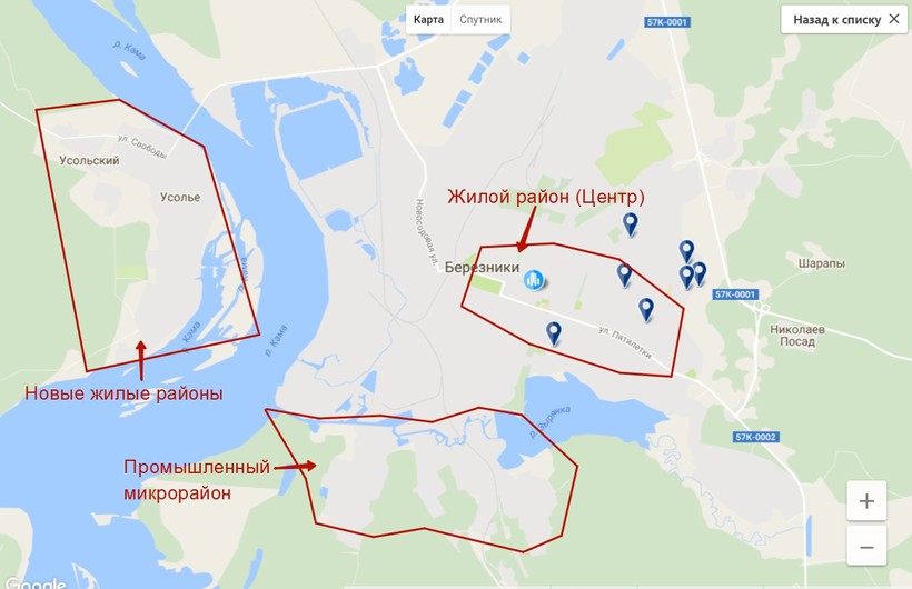 Как такового деления на районы в Березниках нет. Жители ориентируются по улицам, остановкам общественного транспорта и объектам застройки. Могу лишь условно обозначить кое-какие зоны городской застройки: