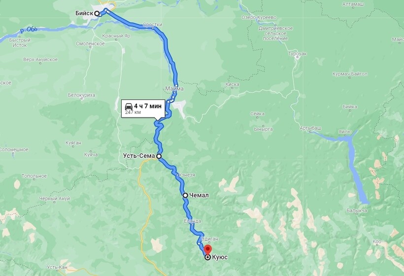 Около села Усть-Сема (через 155 км от Бийска) от основной дороги ответвляется Чемальский тракт (84К-116) и идет по правому берегу реки Катунь до села Куюс.