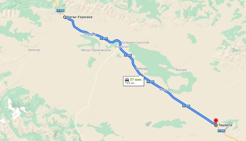 Расстояние Чаган-Узун — Ташанта равно около 78,6 километров.