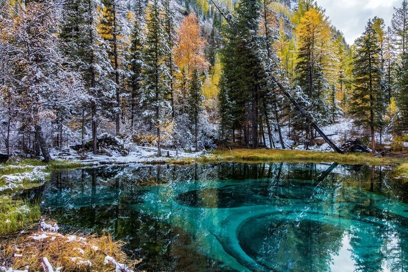 Можно полюбоваться на Гейзерное озеро бирюзового цвета и, если повезет, понаблюдать активность подводных гейзеров. Достопримечательность находится в 6 километрах от с. Акташ, повернуть с трассы на 796-м километре, ориентируясь на базу «Маленький рай».