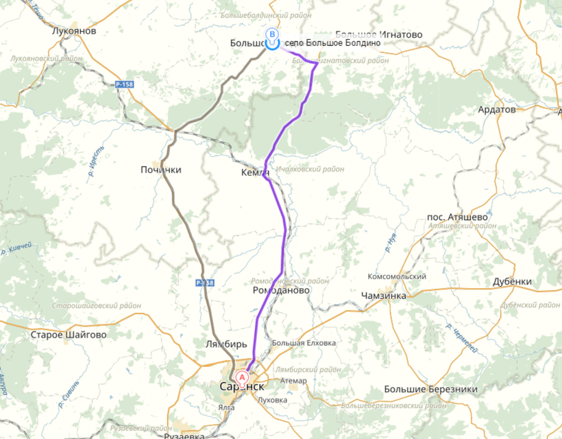 Из Саранска необходимо ехать по трассе 1Р 158 через Лямбирь, Первомайск, Починки, Новая Слобода. Смотреть указатель на Малое, а затем на Большое Болдино. Расстояние составит около 150 км и займет 2-3 часа.