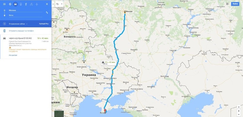 Из Москвы на личном авто до Ялты можно добраться за 18 часов без учета остановок и перерывов на еду. Расходы на бензин составят около 10 тысяч рублей. Дорога будет пролегать через Украину. От Москвы нужно ехать по шоссе Е105, которое ведет напрямую до Ялты, протяженность пути — 1 481 км.