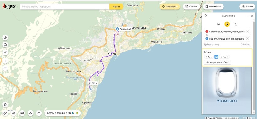 Кроме того, до Ялты можно добраться автобусами и маршрутными такси, которые отходят из аэропорта каждые полчаса. У них нет конкретных маршрутных номеров, на лобовом стекле просто висит табличка с указанием пункта назначения. Время в пути — около 2 часов, стоимость — 150 рублей.
