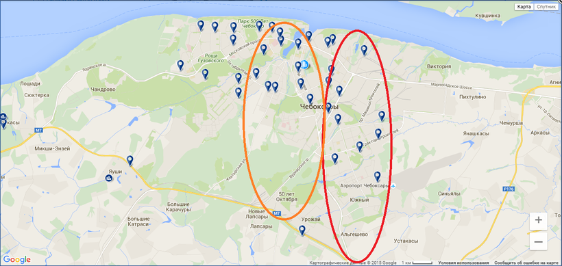 В Чебоксарах районы разделены на 24 микрорайона. Каждый из них входит в состав одного из 3 административных районов. Стоит отметить, что в городе нет острого разграничения по ценам на проживание. Концентрация хостелов и элитных отелей примерно одинакова для каждого конкретного района. Наиболее благоприятными для проживания являются Калининский и Ленинский районы (помечены красным и желтым соответственно).