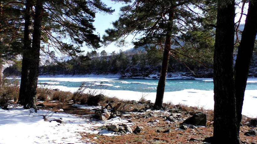Весна здесь начинает ощущаться ближе ко второй половине апреля. В это время воздух значительно прогревается, появляются первые цветочки. А Катунь наполняется водой, которая сходит с гор. От этого она становится полноводной и нередко выходит из берегов. Кстати в это время года, Катунь не ярко-бирюзового цвета, как скажем осенью, а мутно-зеленого.