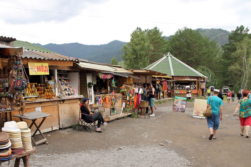 Есть здесь и медовые лавки, в которых можно пополнить запас сладких и полезных для здоровья продуктов. Кроме того, тут большой выбор алтайских чаев. Также здесь можно перекусить, выпить кофе или кислородного коктейля. По факту – это почти цивилизованная торговая площадка в Чемале, не считая супермаркетов.