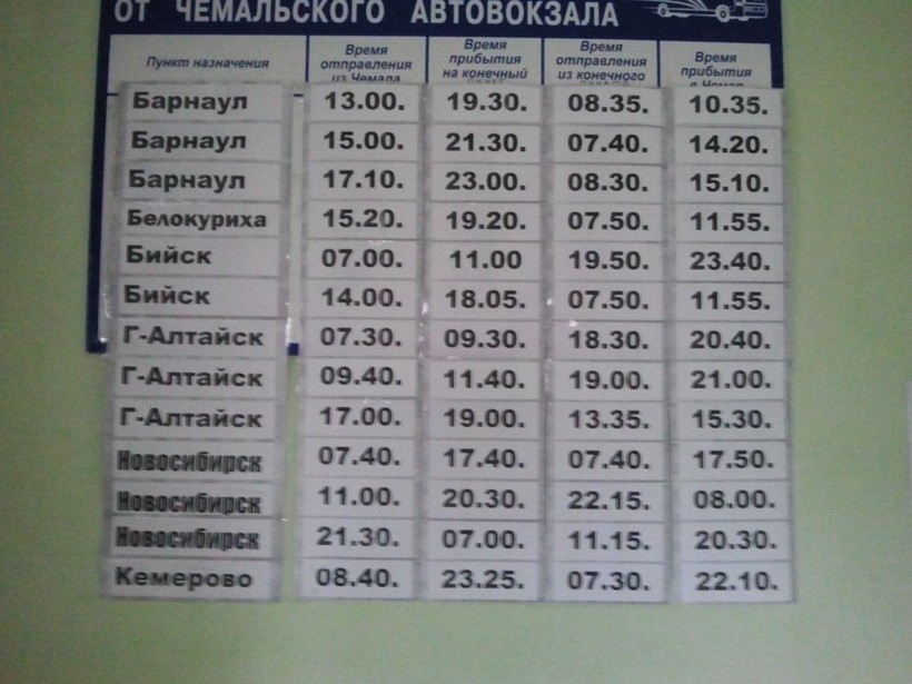 Из Барнаула отходит 5 автобусов в день, которые следуют в Чемал (утром, в районе обеда и вечером). Точное расписание лучше узнавать накануне поездки. Билет в одну сторону стоит 840-890 рублей, дорога занимает 6-7 часов, так как автобус будет делать остановки.