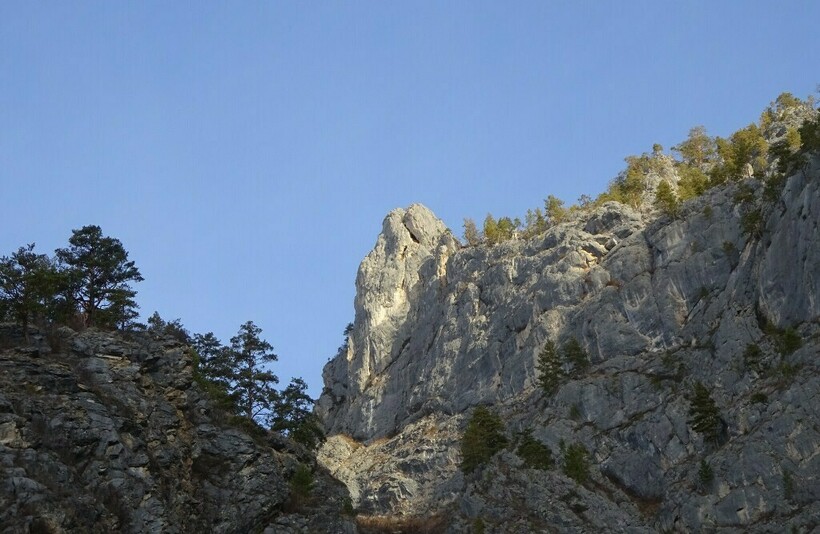 Дальше путь по тропе проходит среди отвесных скал урочища Чечкыш.