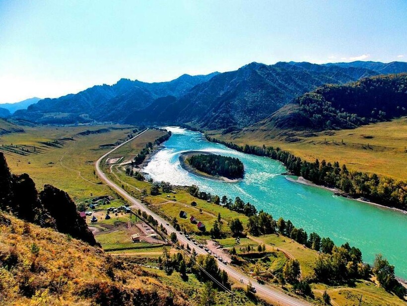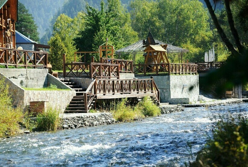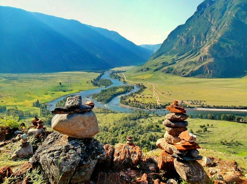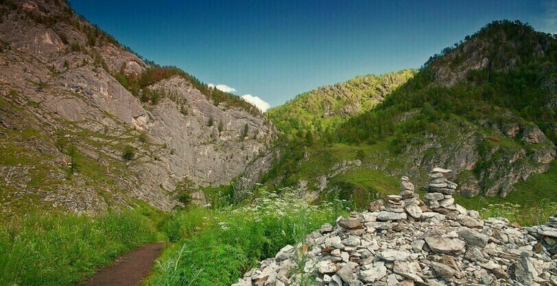 В конце подъема появится конечная цель похода в урочише Чечкыш — смотровая площадка, высота которой позволяет увидеть Катунь, окружающие долину алтайские горы.