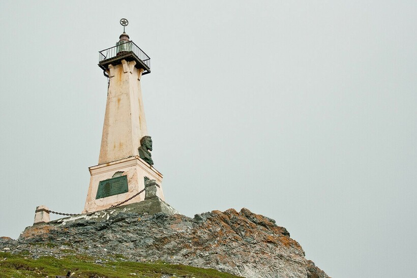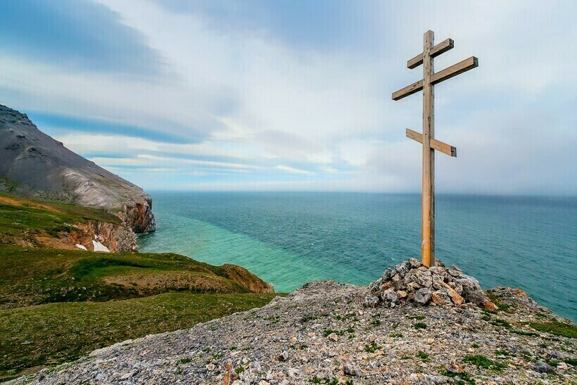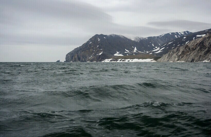 В пасмурный день чукотские берега на фото мыса Дежнёва выглядят сумрачно, величественно и притягательно.