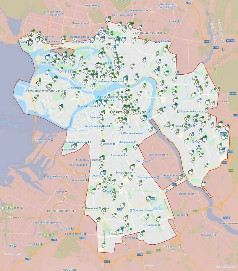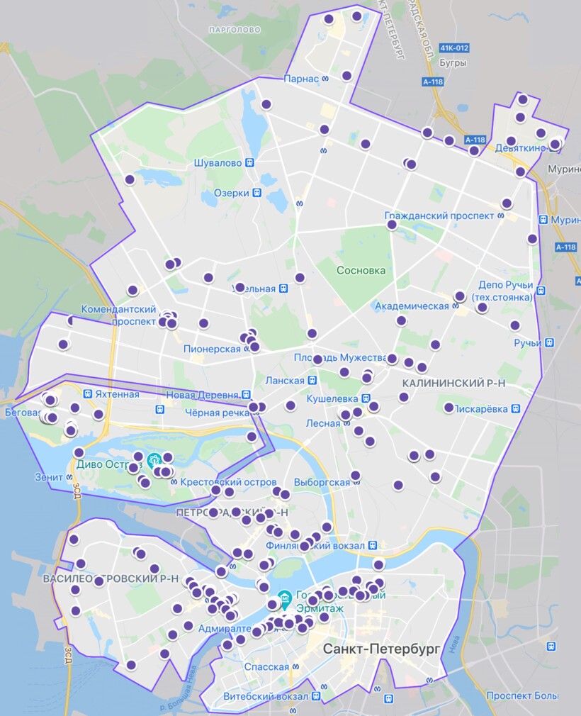 В приложении оператора Whoosh очерчено городское пространство, где доступен прокат самокатов. Санкт-Петербург покрыт самокатными парковками в Адмиралтейском, Центральном, Московском районах. Есть станции на Васильевском острове и Петроградке. Несколько точек открыты в Приморском, Красногвардейском и Калининском районах.