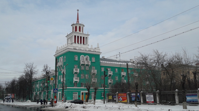 - Дом со шпилем. Этот красивый дом является своеобразным символом города. Он был построен в 1940-х гг. архитектором Алексеем Федоровичем Кусакиным. Дом со шпилем находится на перекрестке проспекта Чкалова и улицы Маяковского. Дом очень органично вписан в окружающее пространство благодаря тому, что у здания неравное количество этажей с разных сторон: по улице Маяковского — 4 этажа, по проспекту Чкалова — 3. Центральная башня насчитывает 5 этажей и завершается шпилем. Недавно здание реставрировалось, его покрасили в яркий оттенок зеленого цвета, благодаря чему оно стало еще более заметным. Мне кажется, это одно из самых интересных зданий города, а между тем, в нем до сих пор живут люди!