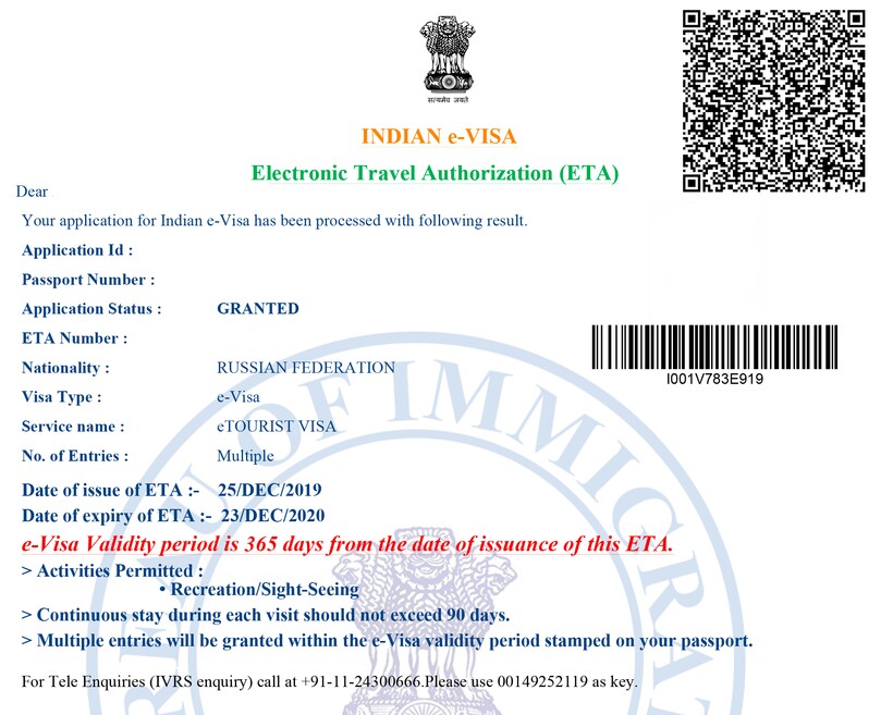 Индия. Цена — 100 $ (7300 ₽) и комиссия банка (2–3 %), срок — до 3 дней. Необходимо предоставить заполненный анкетный бланк на веб-странице индийского правительства, сканы фото и загранпаспорта. Пересечение границы по индийской электронной визе возможно только через 28 аэропортов.