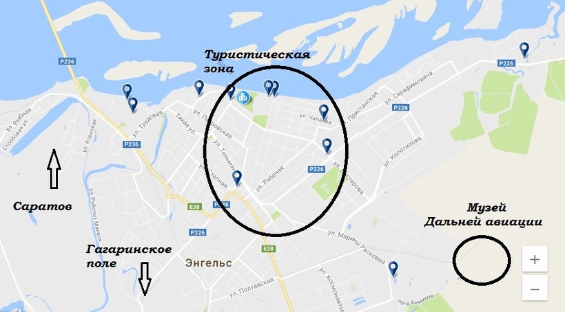 Выбирайте размещение в отелях туристической зоны: вам будет проще перемещаться по городу как пешком, так и на общественном транспорте или такси. В туристической зоне расположились все те достопримечательности, которые мы также рассмотрим более подробно в этой статье: Бульвар Роз, Набережная, Городской парк, музей Льва Кассиля, Энгельсский краеведческий музей, а также кафе, бары, рестораны и многие другие развлечения. Отдельно указано местоположение Музея Дальней авиации, который находится в районе Лётного городка, или как называют его местные, район Лётки.