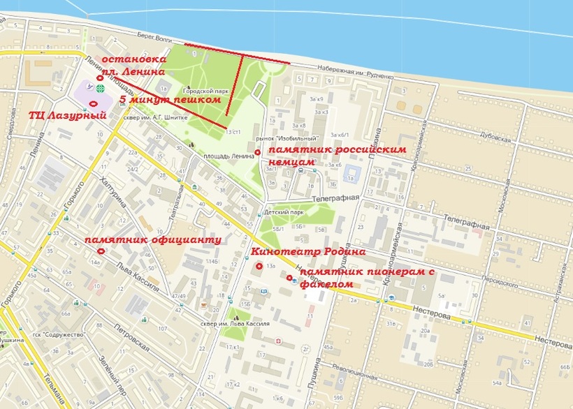 - Выходите на остановке "площадь Ленина", отсюда вы сможете попасть и в городской парк, и на набережную. Здесь же, напоминаю, расположен энгельсский краеведческий музей. После этой прогулки, уверена, длительной и увлекательной, можете отдохнуть в одном из кафе в центре.