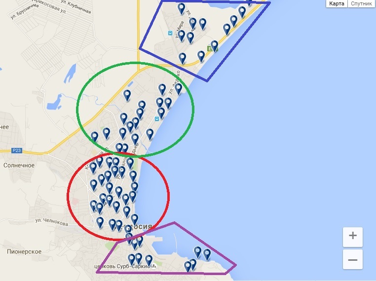 Официального деления на районы Феодосия не имеет. Существует, однако, некоторая неформальная система деления города на 19 районов. Это довольно большое число наименований, в которых будет очень легко запутаться. Поэтому мы с вами пойдем другим путем и сами условно разделим Феодосию на четыре района: южная часть (фиолетовый), центральная часть (красный), северная часть (зеленый) и окраина (синий).