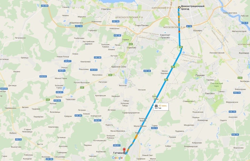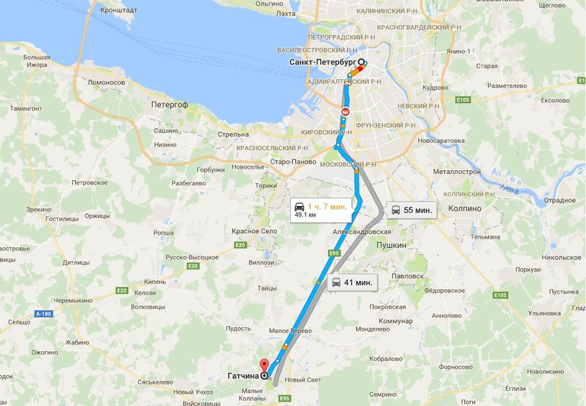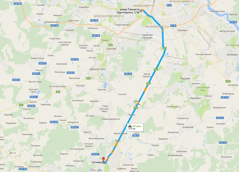 Маршрут Аэропорт Пулково – Центр Гатчины показан на карте ниже.