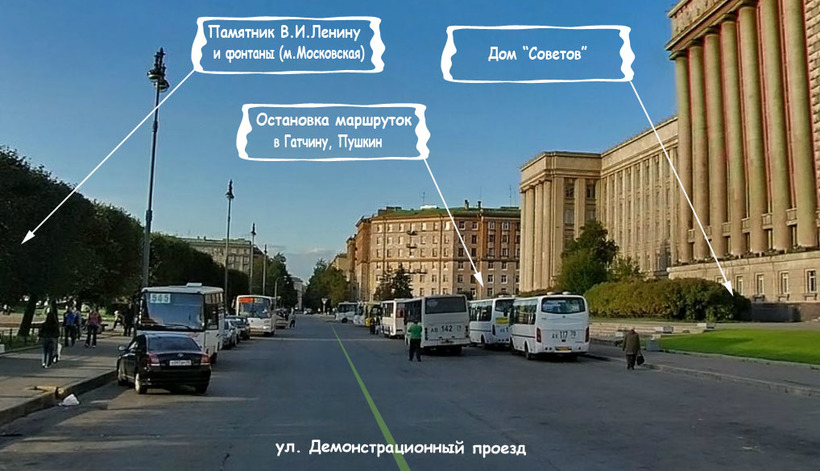 Гатчинские автобусы не привязаны к расписанию, отправляются с интервалом примерно в 10 минут, идут по трем маршрутам, уходят прямо с Московской площади . Их стоянка – за памятником Ленина на улице Демонстрационный проезд. Номера – 18, 18А и 100. Стоимость проезда около 100 RUB. Время в пути примерно 45 минут. Правда, есть вероятность попасть в пробку, которая обычно бывает в пятницу вечером.