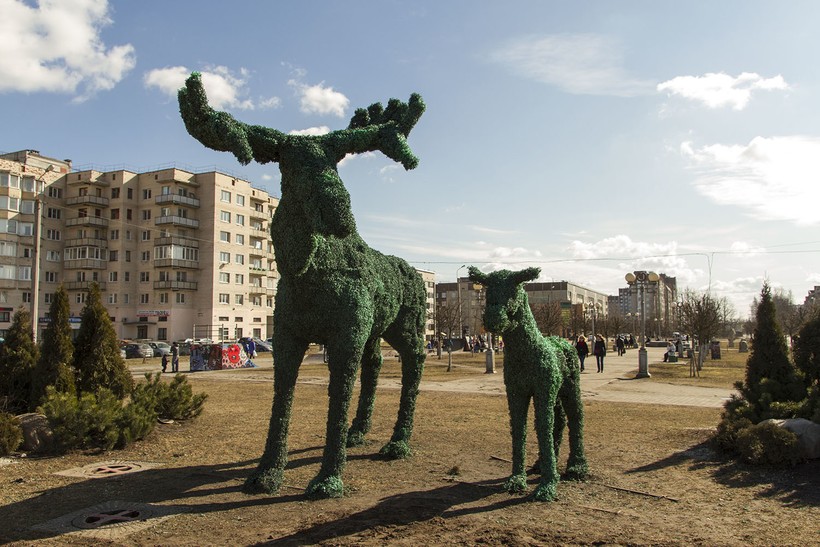 - С правой стороны от ворот вы увидите вторую пешеходную улицу Гатчины, Рощинскую. Там на аллее, где можно передохнуть, стоят скамейки, есть небольшой фонтан и несколько довольно странных скульптур.