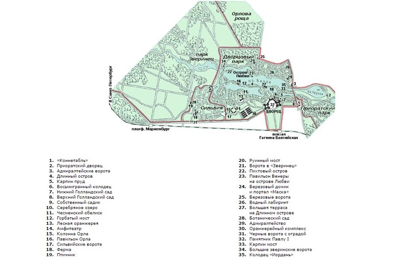 - Дворцовый парк. В парке находятся несколько исторических памятников: павильон Венеры, охотничий Березовый домик, портал Маска, павильон Орла и Чесменский обелиск. О парке я расскажу ниже.