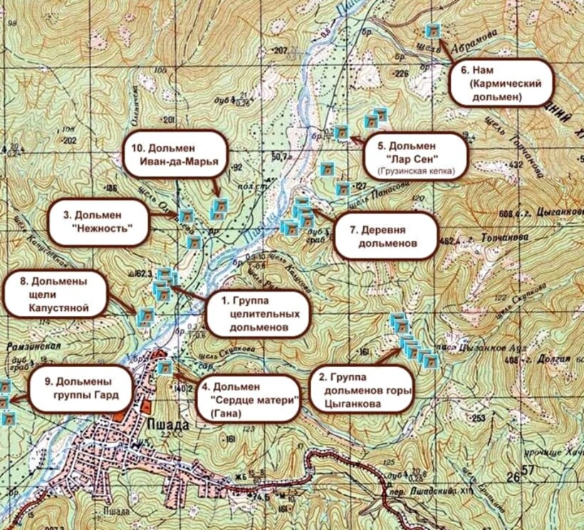 Отдельная карта расположения мегалитических сооружений в Геленджикском районе еще не создана. Археологи и местные краеведы наносят на схемы дольмены возле Геленджика в обследованных ими местностях. Так, на карте окрестностей села Пшада насчитывается 10 групп и отдельных мегалитов.