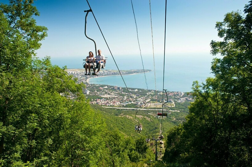 Путешественники также могут подняться к большому кресту в Геленджике на горе с помощью канатной дороги на территории парка «Олимп». Фуникулер располагает открытыми местами, на одном элеваторе поднимается двое человек.