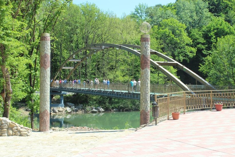 - Пешеходный мост Надежды через Псекупс. Современный подвесной мост пришёл на замену старому висячему и весьма органично вписался в местный ландшафт, словно был здесь всегда. Отсюда открывается незабываемый вид на скалу Петушок и весь Целебный парк в целом.