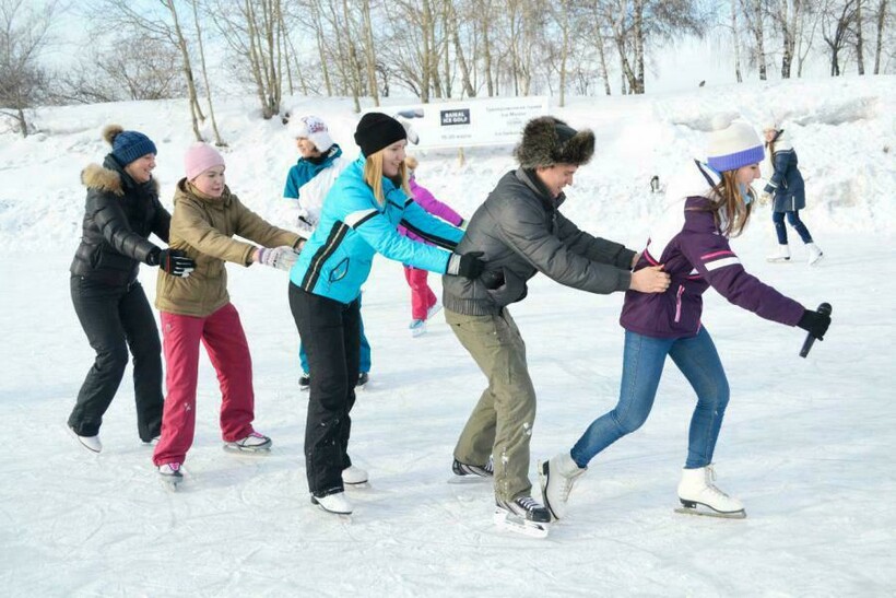 Зимой на Конном заливают самый большой в городе каток и хоккейную коробку, делают ледяные горки. В парке можно: