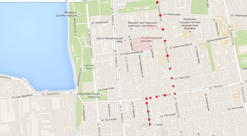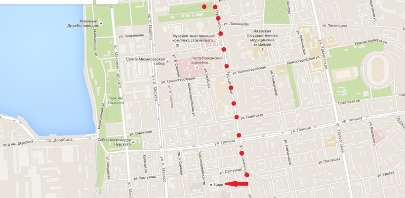 Но тут стоит сказать о том, что эта дистанция с многими друзьями, что приезжали в Ижевск впервые, зачастую затягивалась и на час. Это обуславливалось тем, что самый короткий и удобный путь прокладывается через центральную улицу, которая пестрит большим количеством других памятных мест, привлекающими внимание. Именно поэтому стоит планировать свой путь так, чтобы у вас было в запасе лишних 15-20 минут.