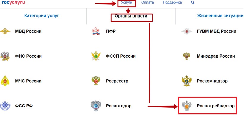 Прежде чем приступить к самому процессу заполнения анкеты (из Турции в Россию или из другой зарубежной страны прилетел россиянин), на главной странице портала Госуслуги перейдите в раздел «Услуги» — «Органы власти» — «Роспотребнадзор», а затем выберите графу «Передача результатов тестов и иммунизации от коронавирусной инфекции».