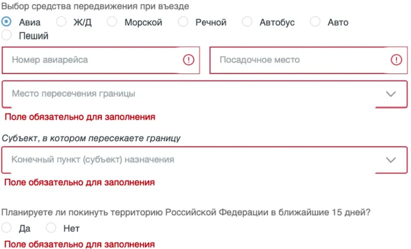 Отметьте средство передвижения, на котором вы вернулись в страну. Поскольку основной транспорт для прибытия из Турецкой Республики — самолет, необходимо будет внести информацию о номере обратного авиарейса и посадочном месте. В графе «Место пересечения границы» необходимо указать населенный пункт, где был осуществлен въезд в РФ.