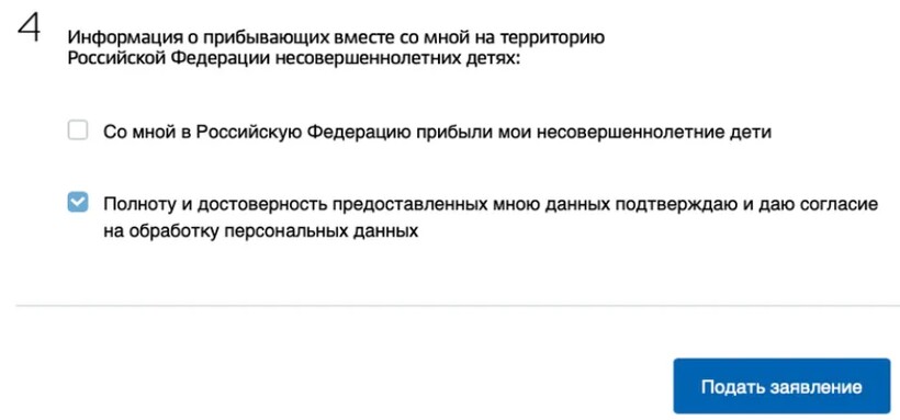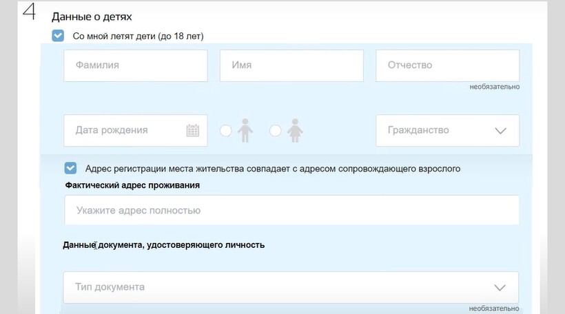 ПОЛЕЗНО. Если несовершеннолетний гражданин РФ вернулся из Турции не с родителем, на этом этапе заполнения онлайн-формы на портале Госуслуги необходимо поставить галочку рядом с пунктом «Ребенок прибыл в РФ без моего сопровождения» и внести информацию о детях — фамилию, имя, дату рождения, данные паспорта.