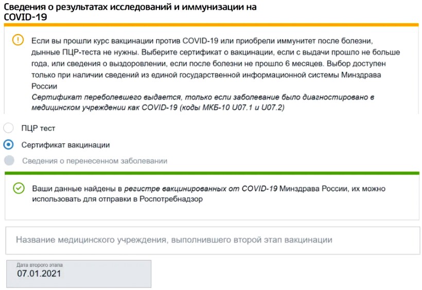 Если россиянин, вернувшийся из Турции, вакцинирован, на портале Госуслуги вносится информация о сертификате вакцинации — учреждение, где проводился второй этап вакцинации, и дата получение второй дозы препарата. Система должна найти сертификат в регистре вакцинированных и автоматически загрузить его в форму.