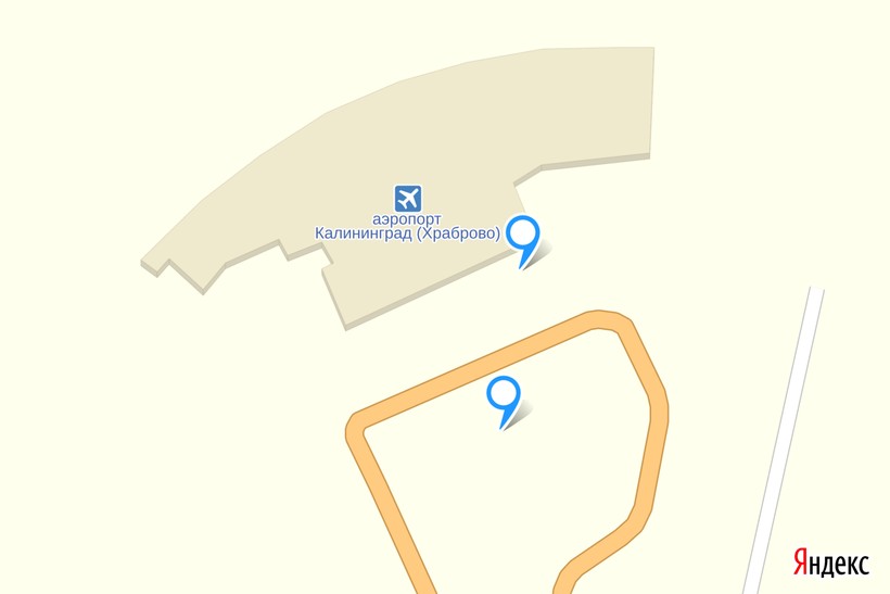 Точка рядом с аэропортом – автобусная остановка, а отметка в оранжевом многоугольнике – стоянка такси и частных автомобилей.