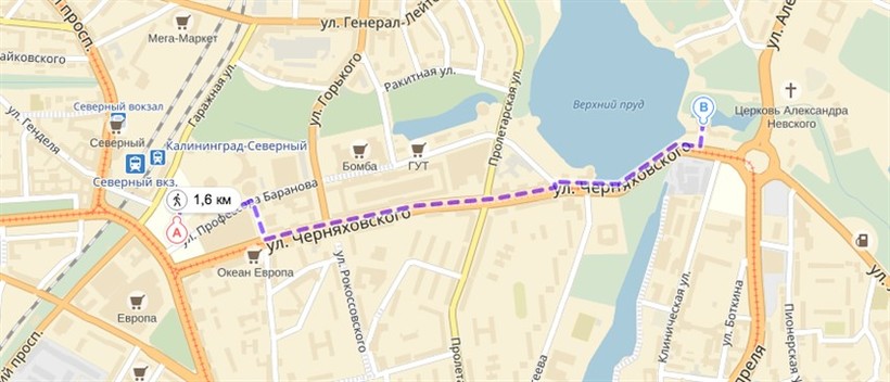 Расстояние от площади Победы до музея Янтаря пешком – 1,6 километра. Бодрым шагом вы дойдете минут за 20-30. Вам следует двигаться по улице Черняховского в сторону Площади Василевского.