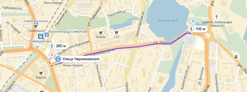 Ехать вам предстоит до остановки «Площадь Маршала Василевского». Займет это примерно 10-15 минут (зависит от пробок, коих в Калининграде все больше и больше с каждым годом) и обойдется вам в 18 рублей за поездку на автобусе или в 22 рубля за поездку на маршрутном такси.