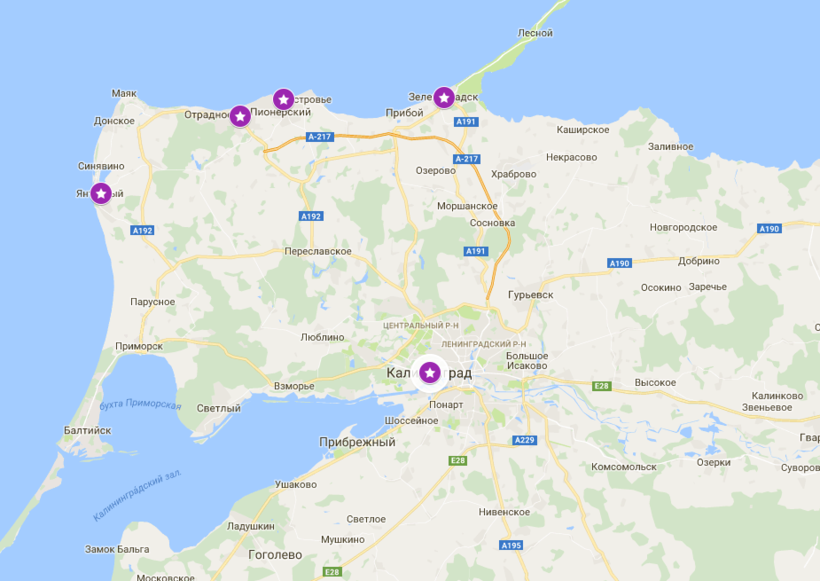 - Калининград. Административный центр подходит тем, кто собирается посетить не только основные туристические маршруты в городе и на побережье, но и прокатиться в другие города области, такие как Черняховск, Гвардейск, Советск и другие. Здесь, во первых, сконцентрирован весь доступный транспорт, а, во-вторых, наиболее развита городская инфраструктура. Выхода к морю Калининград не имеет, до Балтийского примерно 30 километров пути. Из города удобно будет отправиться в любой запланированный пункт вашего путешествия, просто и быстро арендовать авто и легко найти место для обеда.
