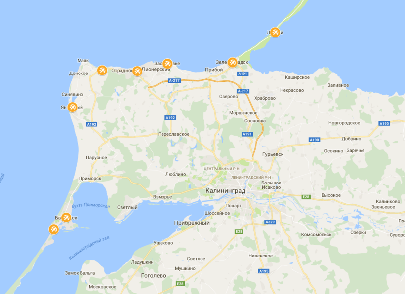 Прибрежных зон в области много, основные потоки отдыхающий стекаются к несколько населенных пунктов – это Зеленоградск, Балтийск, Светлогорск, Пионерский, Янтарный и пляжи на Куршской и Балтийской косе.