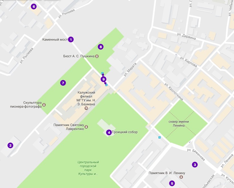 Добраться до Каменного моста от многих городских достопримечательностей можно пешком, ведь Калуга – город небольшой. Если же вы хотите воспользоваться общественным транспортом, сюда идут троллейбусные маршруты 1, 2 и 3, а также автобусы и маршрутки с тем же номером. Остановка общественного транспорта на карте выше обозначена цифрой 9, так что заблудиться у вас не получится при всем желании. Вызывая такси смело называйте просто Каменный мост – любой водитель доставит вас сюда без труда, а пользуясь навигацией, ищите улицу Баженова или улицу Пушкина – именно эти две улицы соединяет мост.