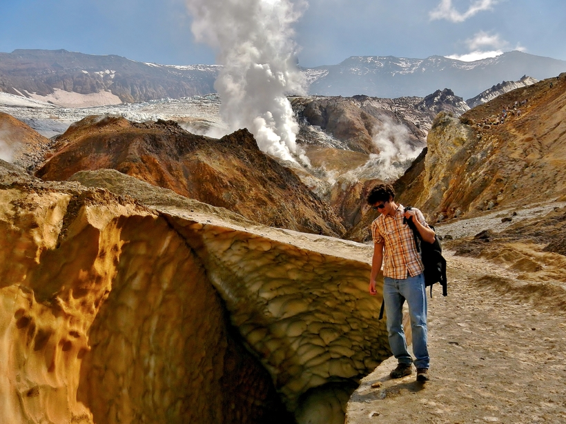 Однако, по-моему, фумарольное поле в кратере Мутновского вулкана – зрелище не менее фантастическое, и при этом до него в буквальном смысле «можно дотронуться рукой». Конечно, при возможности, стоит посетить оба этих места, но я никогда не понимал людей, которые жалуются на стоимость вертолётной экскурсии, но при этом не были на Мутновке:)