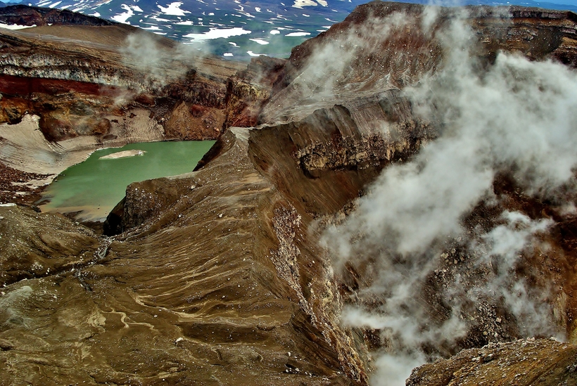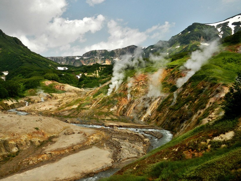 Почти из любого места в городе видны заснеженные шапки вулканов. В ясную погоду, кажется, что они нависают над городом, как небоскребы на афише «Inception», и если вовремя не свернуть на светофоре, то скоро забуксуешь в вулканическом шлаке. В действительности до «Домашних вулканов» чуть больше 30 километров. Преодолеть это расстояние зимой можно на снегоходе, а летом в сухое время почти на любом автотранспорте (один раз мы с друзьями добирались на обычном легковом такси, по камням и грязи до самого подножья. Пришлось платить по загородному тарифу…), но надежнее всё-таки использовать внедорожник. «Домашние вулканы» образуют целый горный хребет со множество вершин, но обычно выделяют только три основные вулканические постройки: Корякский, Авачинский и Козельский вулканы. Склоны Корякского испещрены глубокими бороздами. Он самый высокий из «Домашних» — 3456 метров, и восхождение на него требует альпинистской подготовки. Подняться на Авачинский намного легче, но голова на плечах всё равно потребуется: если до конца не уверен в себе, иди с гидом или опытным человеком. Это горы! Да, те самые, которые бывают очень жестокими. Путь наверх займёт от 4 до 7 часов, даже для выносливого человека это приличная нагрузка, но с ней справляются и дети, и пожилые. Прислушивайся к своему самочувствию, но будь честным – этому в конечном итоге и учит Камчатка. Корякский и Авачинский – действующие вулканы. Из города обычно видно как курится (ударение на «и») Авача, две струйки белого «дыма» тянуться вверх и подмешиваются к облакам. Отверстия и трещины в склонах и кратере, сквозь которые наружу выходит сероводород и пар, называются фумаролами. Выбросы газа ещё не говорят о скором извержении вулкана, но я бы не стал гарантировать и то, что земля просто не провалится у тебя под ногами. В отличие от соседей Козельский вулкан считается потухшим. На его склоне традиционно устраивают летний сноубордический лагерь. В мае или начале июня устанавливают бугельный подъёмник, который не успокоится до тех пор, пока еще есть хоть немного снега, иногда до середины августа. Дальше, за Авачинским перевалом, начинается Налычевская долина, входящая в природный парк «Вулканы Камчатки». До центрального кордона, где расположены горячие источники, теоретически можно добраться на вахтовке со стороны океанского побережья. Но правильнее, мне всё-таки кажется, отправиться сюда пешком по экологической тропе из села Пиначево через одноимённый перевал. Можно придумать интересный и не слишком сложный маршрут примерно на неделю.