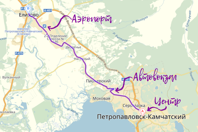 До центра Петропавловска-Камчатского из аэропорта автобус идёт около 35 минут (остановка «Центральный рынок», конечная), но можно выйти и раньше на «Автовокзале» (10 километр).