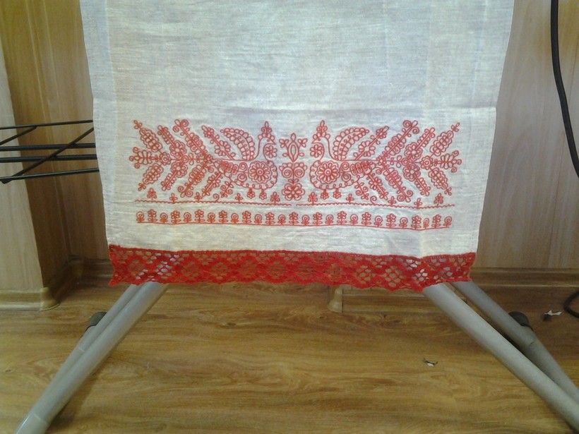 Полотенца, прихватки, передники с карельской вышивкой. Ее легко отличить от всякой, другой. Она выполняется красными нитками, и представляет собой узоры или сценки из прямых линий. Выгнутых или дугих линий — тут почти нет. Стоимость — от 150 RUB.